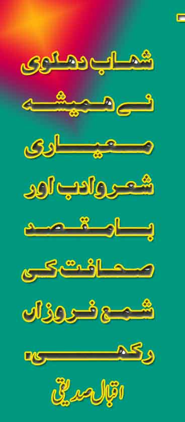 |Home | Biography| Pictures | Publications | Urdu Academy Bhawalpur |Shahab Academy | Poetry | |Views | Work on Shahab |Awards | Shahab's Message | Address |............................................. |